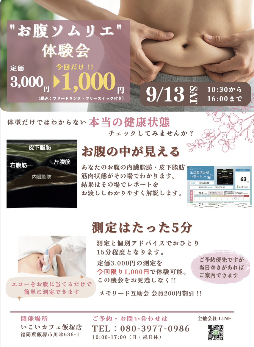 今月もお腹ソムリエ測定会を飯塚市にある【いこいカフェ飯塚店】で開催いたします!!
